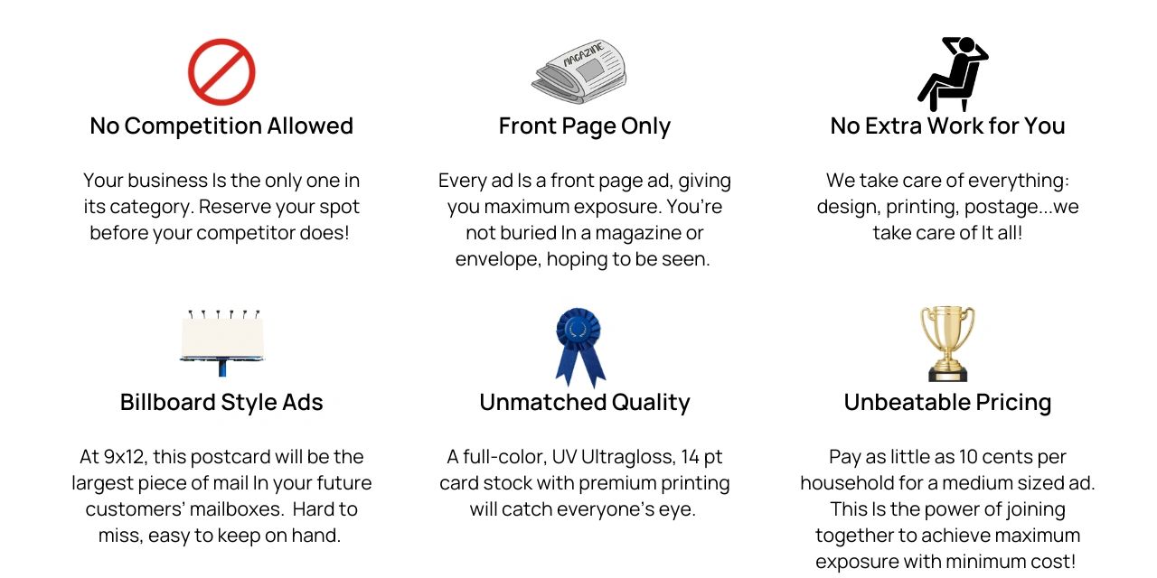 Local Businesses can now showcase their brand on a large 9"x12" postcard sent straight to roughly 5,000 homes in the community, which can be 10,000 or more customers (2 people per household)!